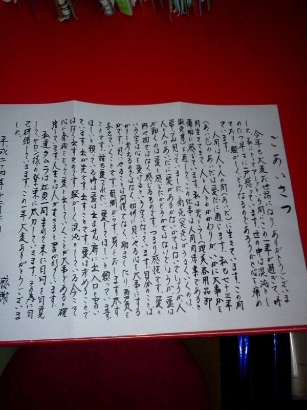 昔からお世話になっている社長さんから お手紙頂きました・・ スタッフみんな心に熱いものを感じ 手紙をとうし 自然とミーティング&ディスカッションし 4人の思いを1つにしてお客様に全力でお手入れ させて頂こうと再度気持ちを1つにしました 中身を少し・・ 人間は 人と人の間(あいだ)に生きています。 この間(あいだ)の あいだは 愛だ(あいだ) に通じます。 愛という字は心を受けると書きます。 みなさまもなにか感じてもらえると 幸いです