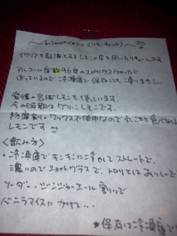 手作りレモンママレード 指でペロッとつまみ食い 美味しい~い 手作り レモンリキュール 飲み方のメモまで付けてもらって 感動で~す 今晩が楽しみです ロックでいただいちゃお ありがとうございまーす
