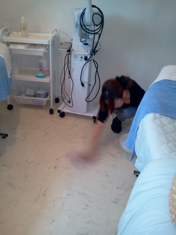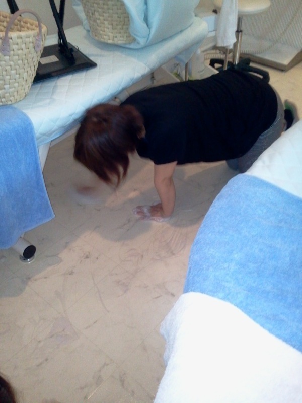 お仕事終了後 ずっと気になってた床をみんなで拭き掃除 白くてピッカピッカ